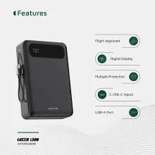 Green Lion Toledo دارای نمایشگر دیجیتال است که میزان شارژ باقیمانده را بهصورت دقیق نمایش میدهد و برنامهریزی برای شارژ دستگاهها را آسان میکند. این پاوربانک همچنین با چندین حفاظت ایمنی، از جمله حفاظت در برابر ولتاژ بیش از حد، اتصال کوتاه و حرارت بالا، امنیت کامل دستگاههای متصل را تضمین میکند. نکته مهم دیگر این است که Toledo Flight Approved بوده و برای حمل در پرواز مناسب است.