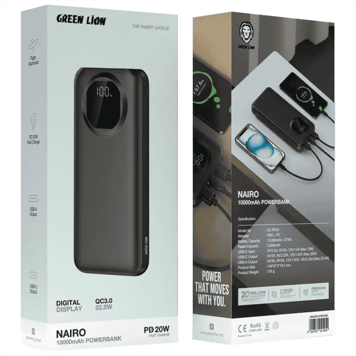 Green Lion Nairo 20000mAh PD 20W یک پاوربانک سریع، سبک و قابلاعتماد است که با ظرفیت مناسب، شارژ سریع واقعی و طراحی مقاوم، نیاز کاربران روزمره را بهطور کامل پوشش میدهد. اگر دنبال پاوربانکی جمعوجور با توان شارژ بالا هستی، این مدل یکی از بهترین انتخابهاست.